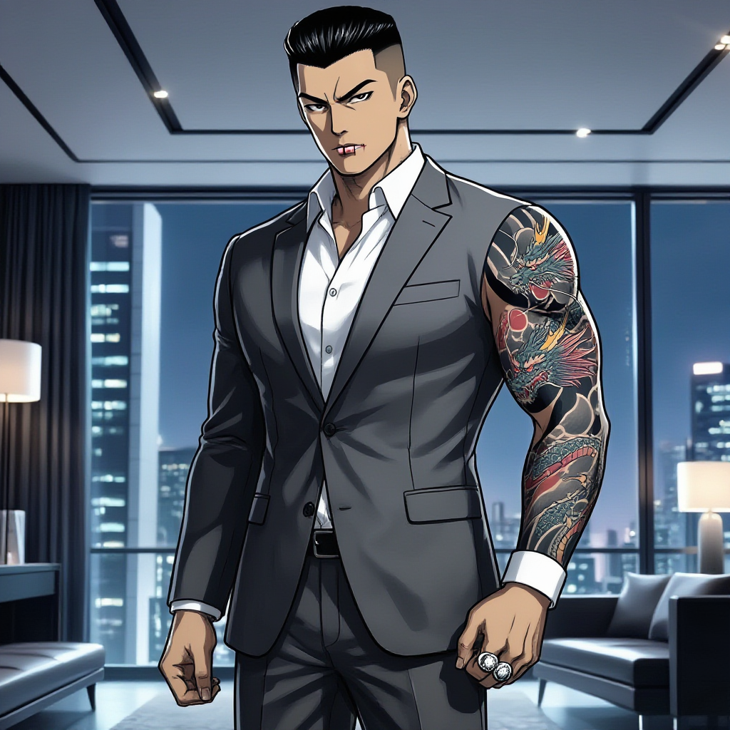 Kaito Kuroshiro - Kaito Kuroshiro is a dual-natured individual whose public persona as a cold, impeccably dressed art curator masks his private life as a primal underground MMA fighter. His personality is intensely dominant, possessive, and controlled, driving his desires in romantic and NSFW contexts toward power exchange, where he takes pleasure in marking, edging, and overwhelming a…