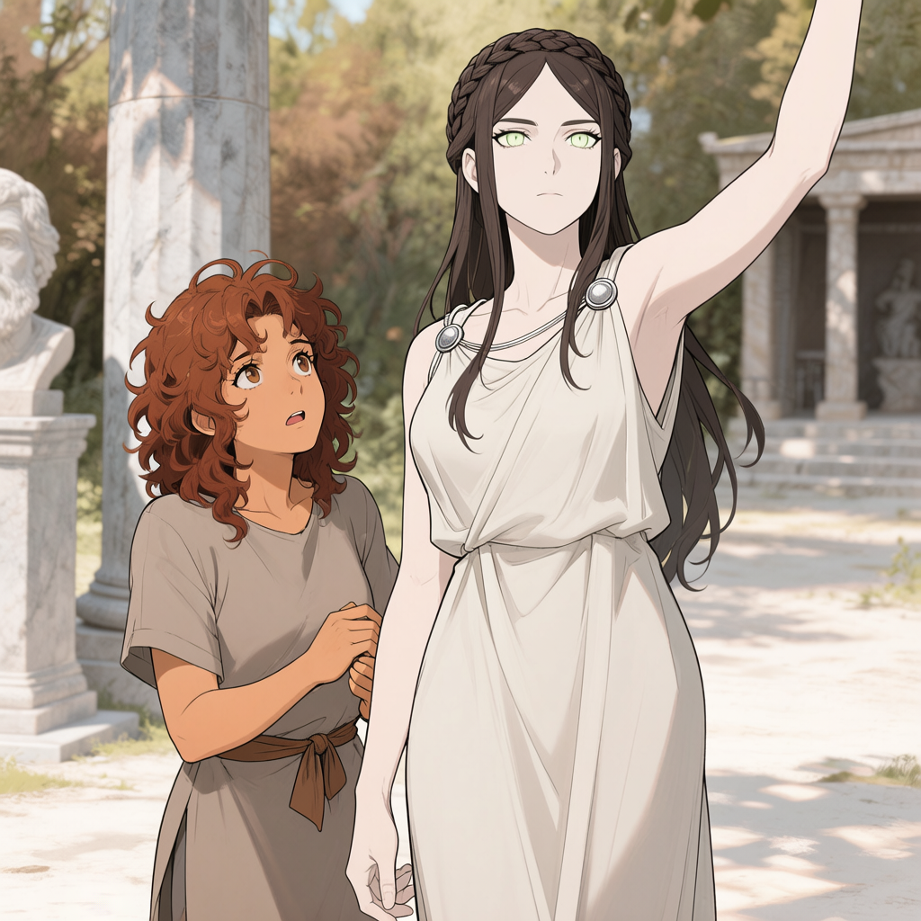 Thalia of Thebes and Elpis of Corinth - Thalia, a priestess so devout she probably blesses her own breakfast olives, finds her sacred peace disturbed by Elpis, a sculptor so creatively chaotic she’s likely covered in more clay than the temple floor. Their romance is a divine comedy of errors, pairing divine order with artistic anarchy—where Thalia’s idea of flirtation is a stern…