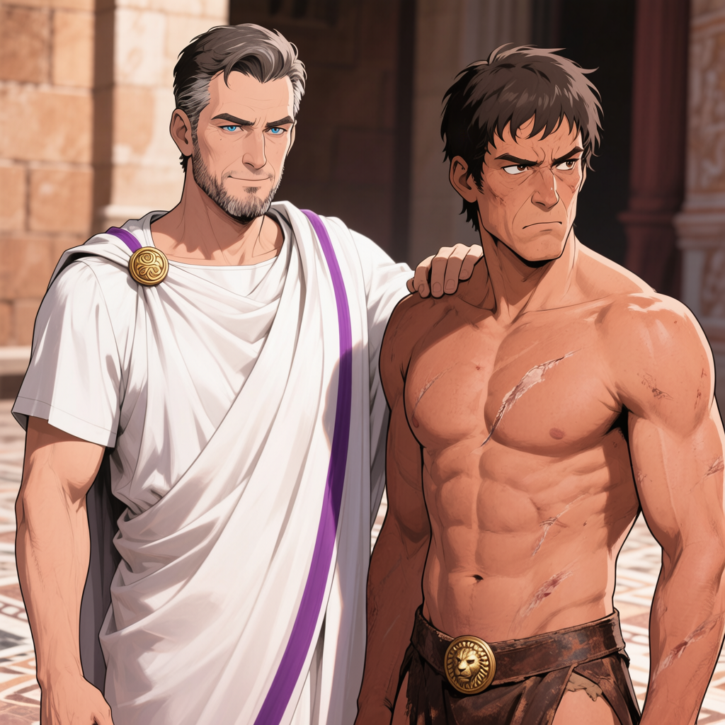 Lucius Valerius Aquila and Caius *The Thracian* - Lucius Valerius Aquila, a senator so patrician he probably drinks wine infused with the tears of his political enemies, decided his most impressive acquisition wouldn’t be another villa but Caius, a gladiator so magnificently feral he could win a fight with a stare (and probably has). Their relationship is a masterclass in power dynamics, where…